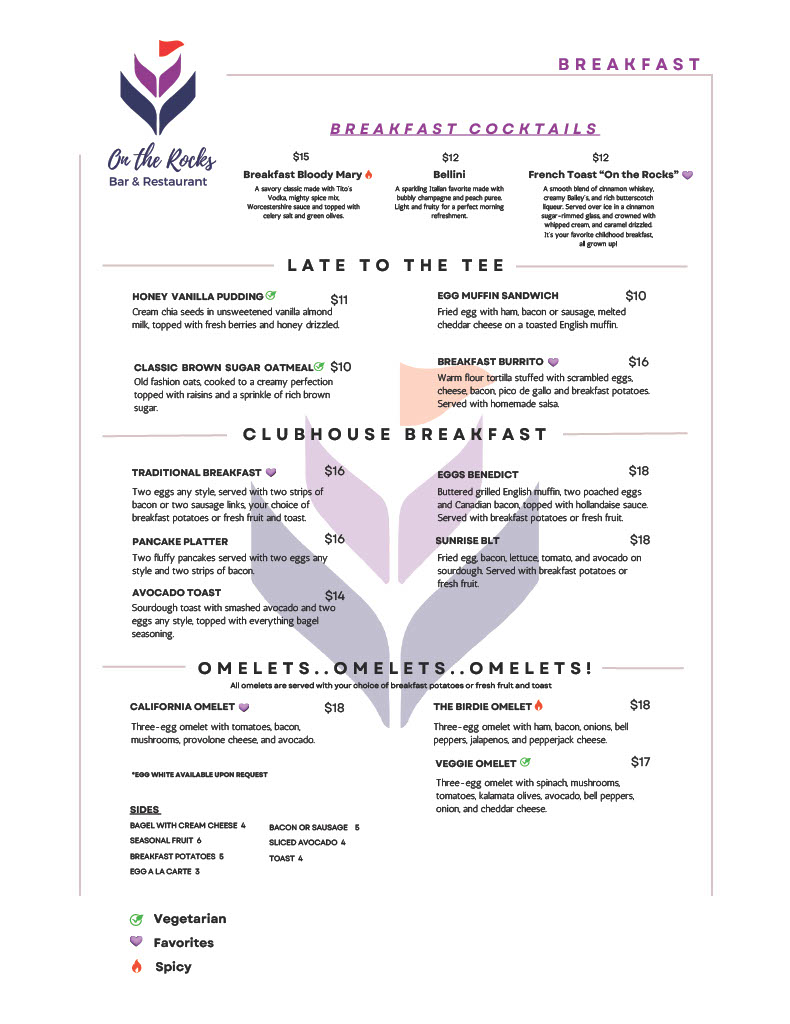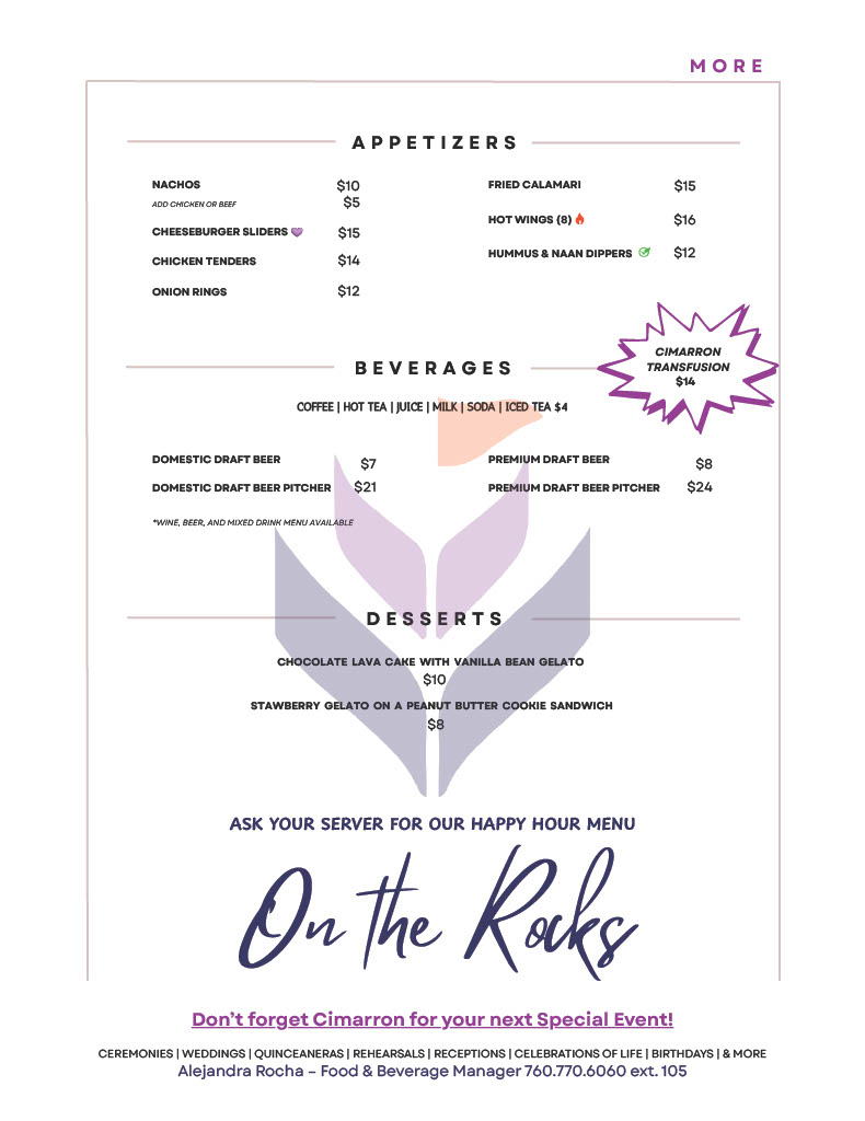 Enjoy indoor or outdoor dining at our fabulous “On the Rocks” Restaurant featuring breathtaking 180-degree views of the beautiful San Jacinto & Santa Rosa Mountain Ranges. On the Rocks features a hearty cuisine for hungry golfers, with daily food & drink specials available. Come see why On the Rocks was named “The Best Place to Watch the Sunset” in Palm Springs.